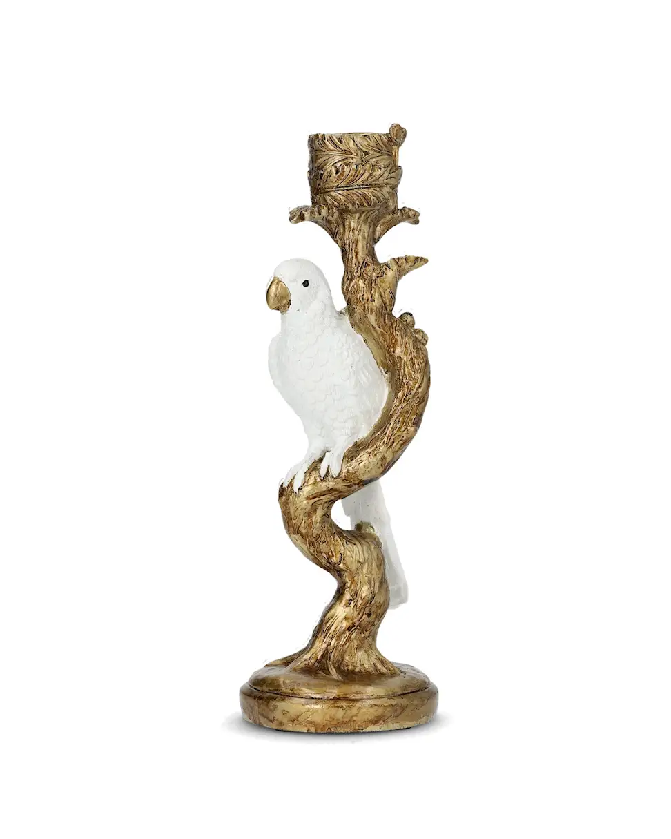 Candlestick with a bird on a branch. When you want a playful and exotic touch to your décor. Made from poly.