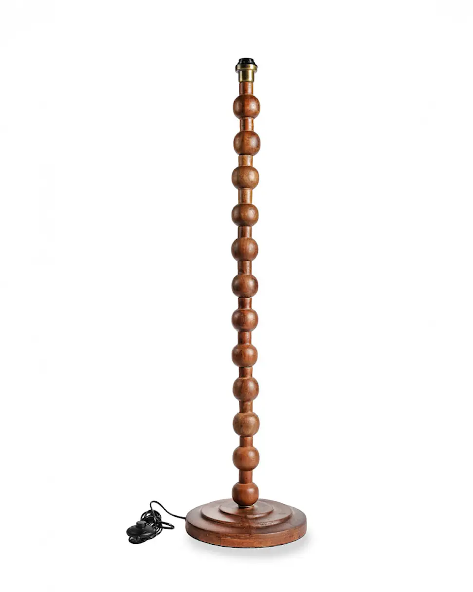 Floor lamp base with wooden spheres along the length, made from wood and metal. Gives a warm and cozy feeling at home.