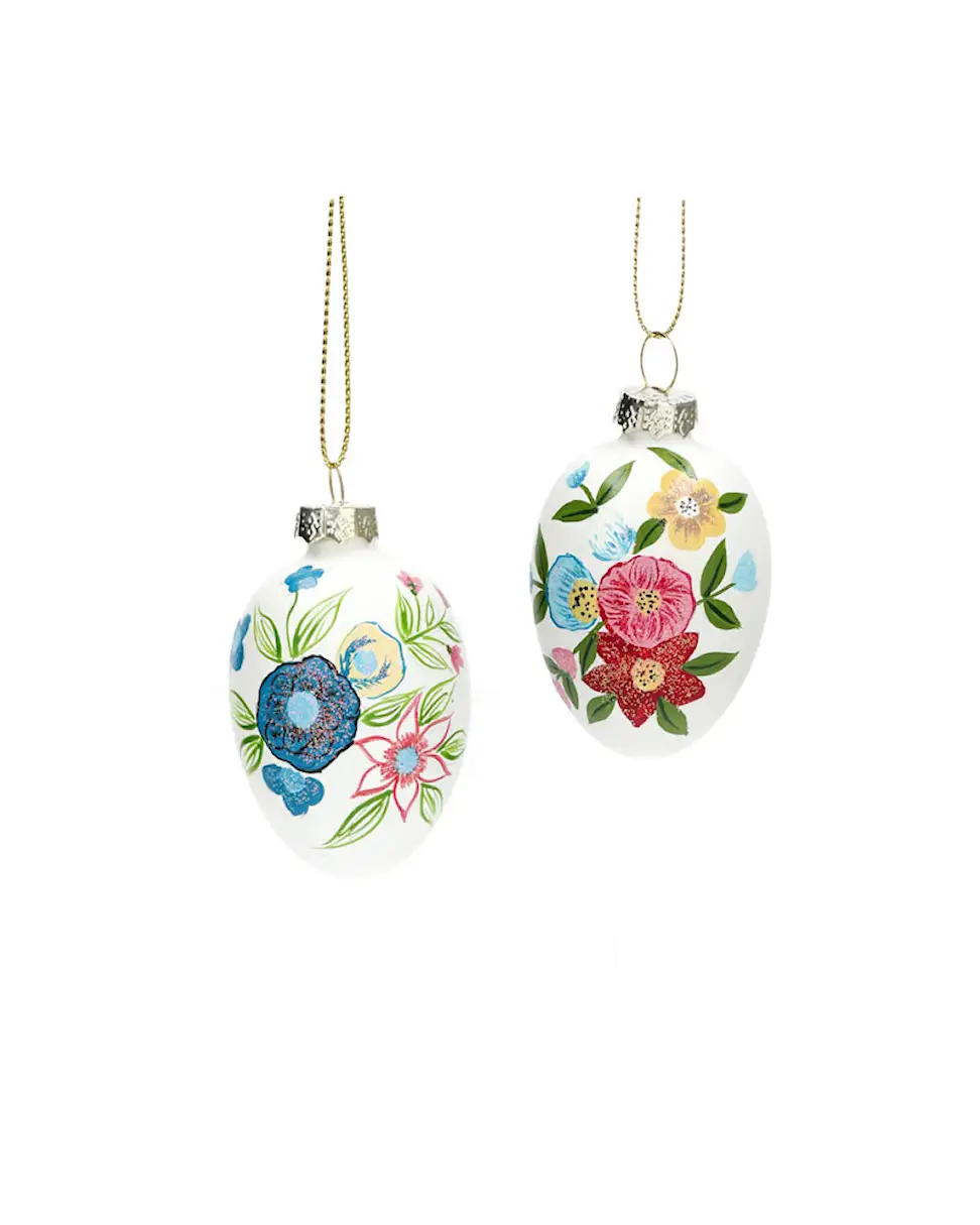 Decorate an arrangement of twigs or an easter bouquet with these hanging eggs with glittery floral details. Made from glass.