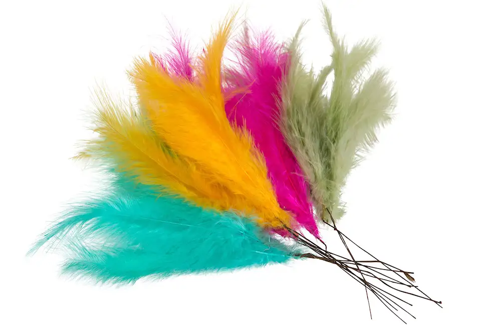 Pörröiset, langalla koristellut höyhenet sopivat täydellisesti oksien tai kukka-asetelmien koristeluun. Saatavilla eri väreissä.