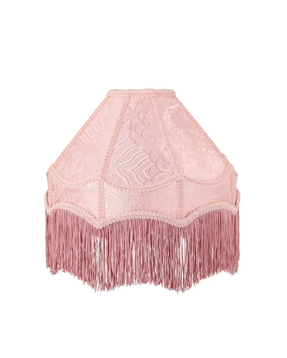 Vaaleanpunainen lampunvarjostin hapsuilla, kauniisti ommeltu reunus ja siistit kuviot. Voidaan käyttää pöytävalaisimena tai kattovalaisimena. Saatavana useissa väreissä.