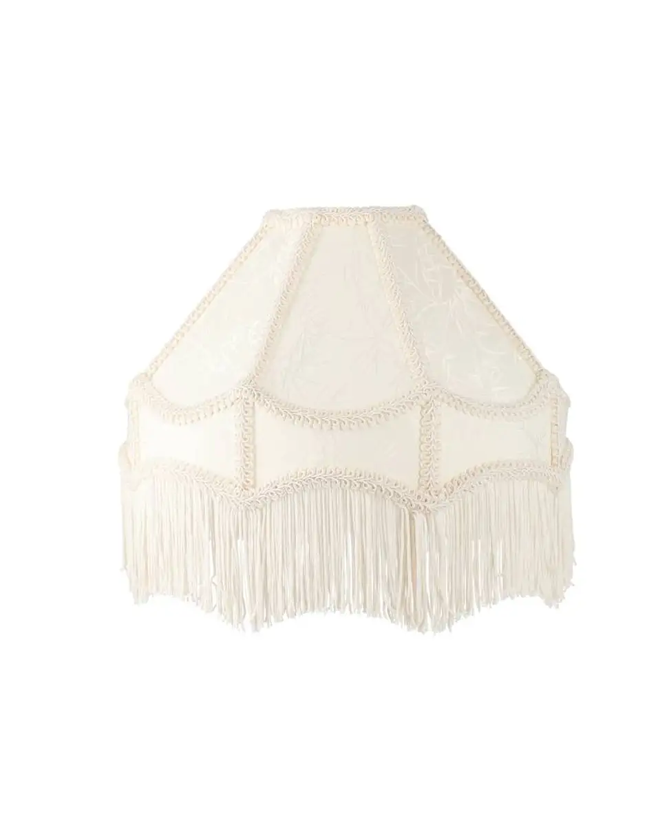 Kermanvärinen lampunvarjostin, jossa on hapsuja, kauniisti ommeltuja reunuksia ja siistejä kuvioita. Voidaan käyttää pöytävalaisimena tai kattovalaisimena. Saatavana useissa väreissä.