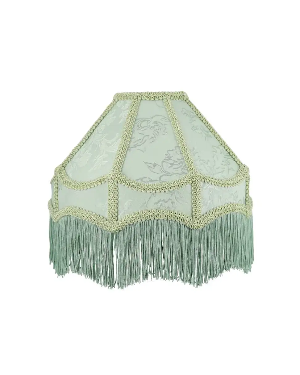 Pistaasipähkinänvärinen lampunvarjostin, jossa on hapsuja, kauniisti ommeltuja reunuksia ja siistejä kuvioita. Voidaan käyttää pöytävalaisimena tai kattovalaisimena. Saatavana useissa väreissä.