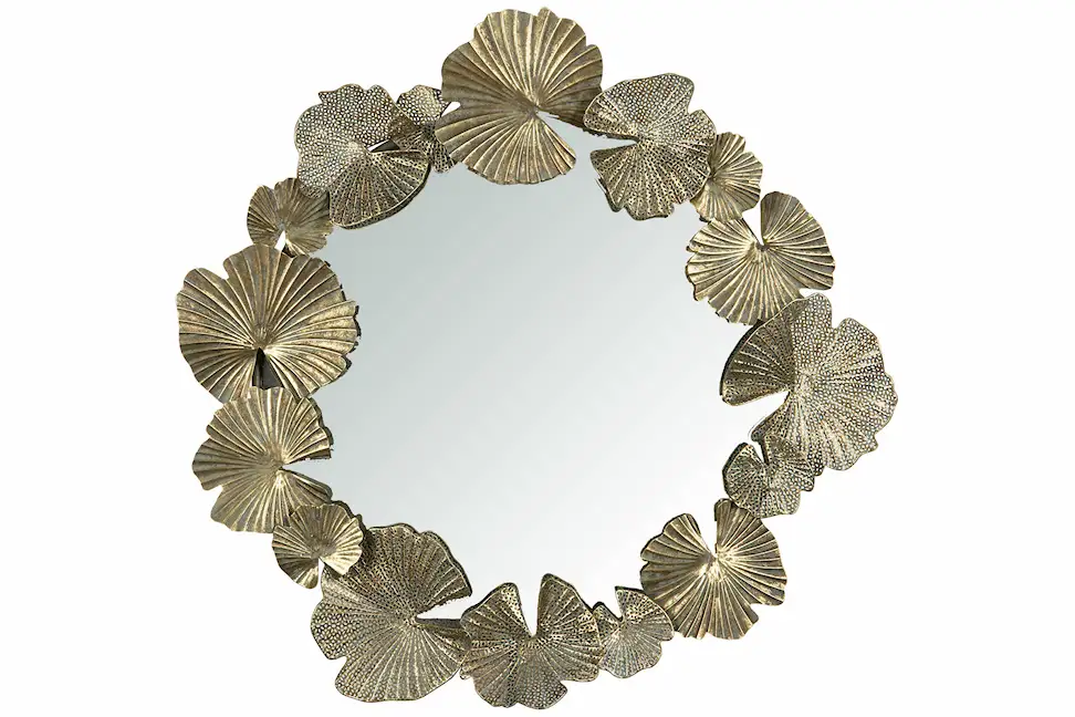 Rund spegel med en ram av löv är en dekorativ inredningsdetalj som passar bra i hemmets alla rum. Tillverkad i spegelglas och metall.